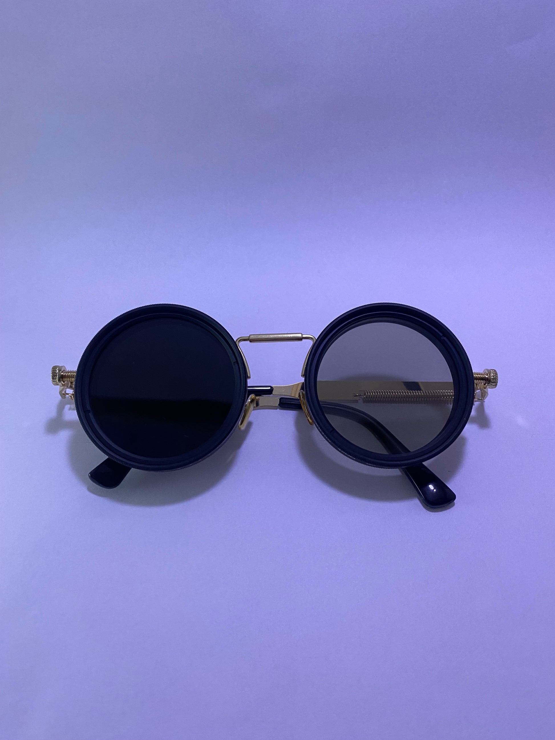 This adjustable pair of sunglasses combines elegant design with practical functionality. The temples are made of high-quality gold-toned metal and feature black, ergonomically shaped plastic tips for maximum wearing comfort. Both the nose bridge and the adjustable nose pads are also adorned in gold, matching the refined design. The inner side of the frame features golden accents, while the outer frame is styled in classic black with a slightly thicker, reinforced design.