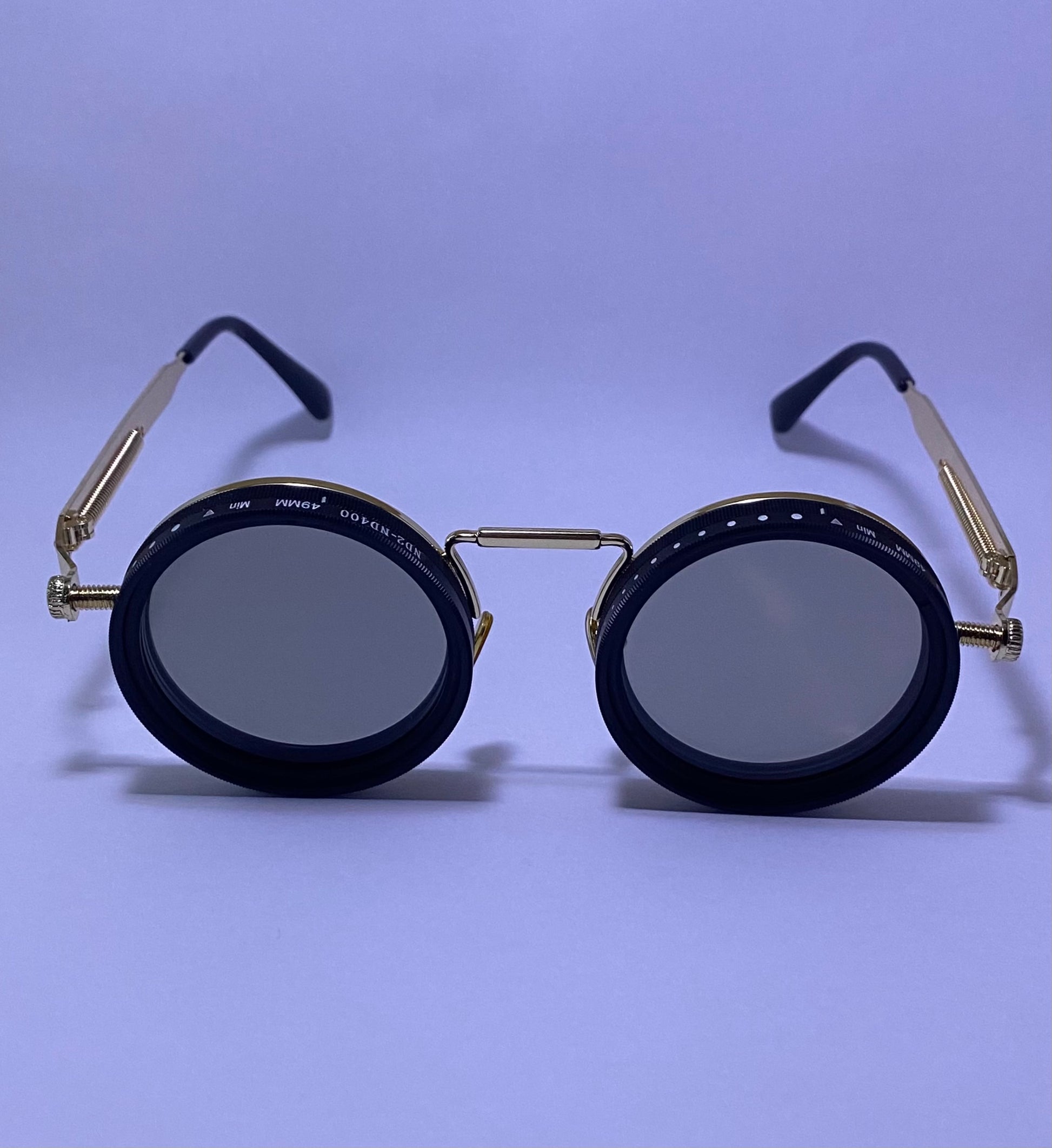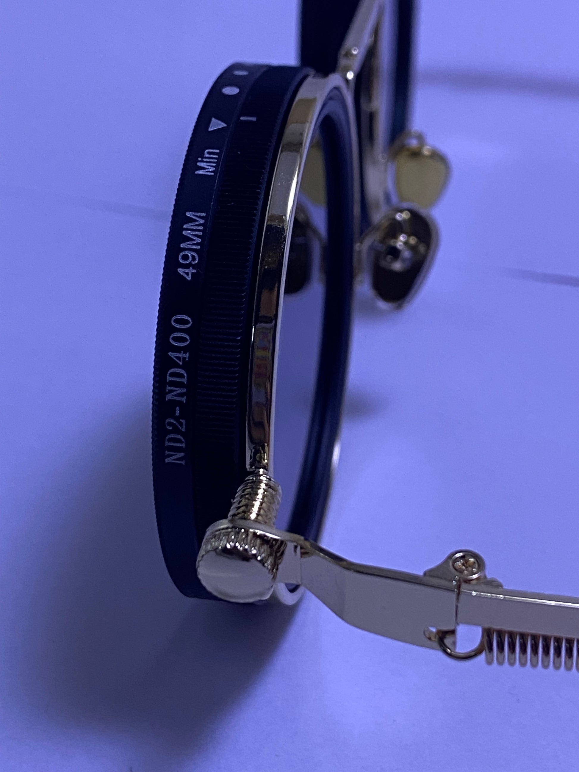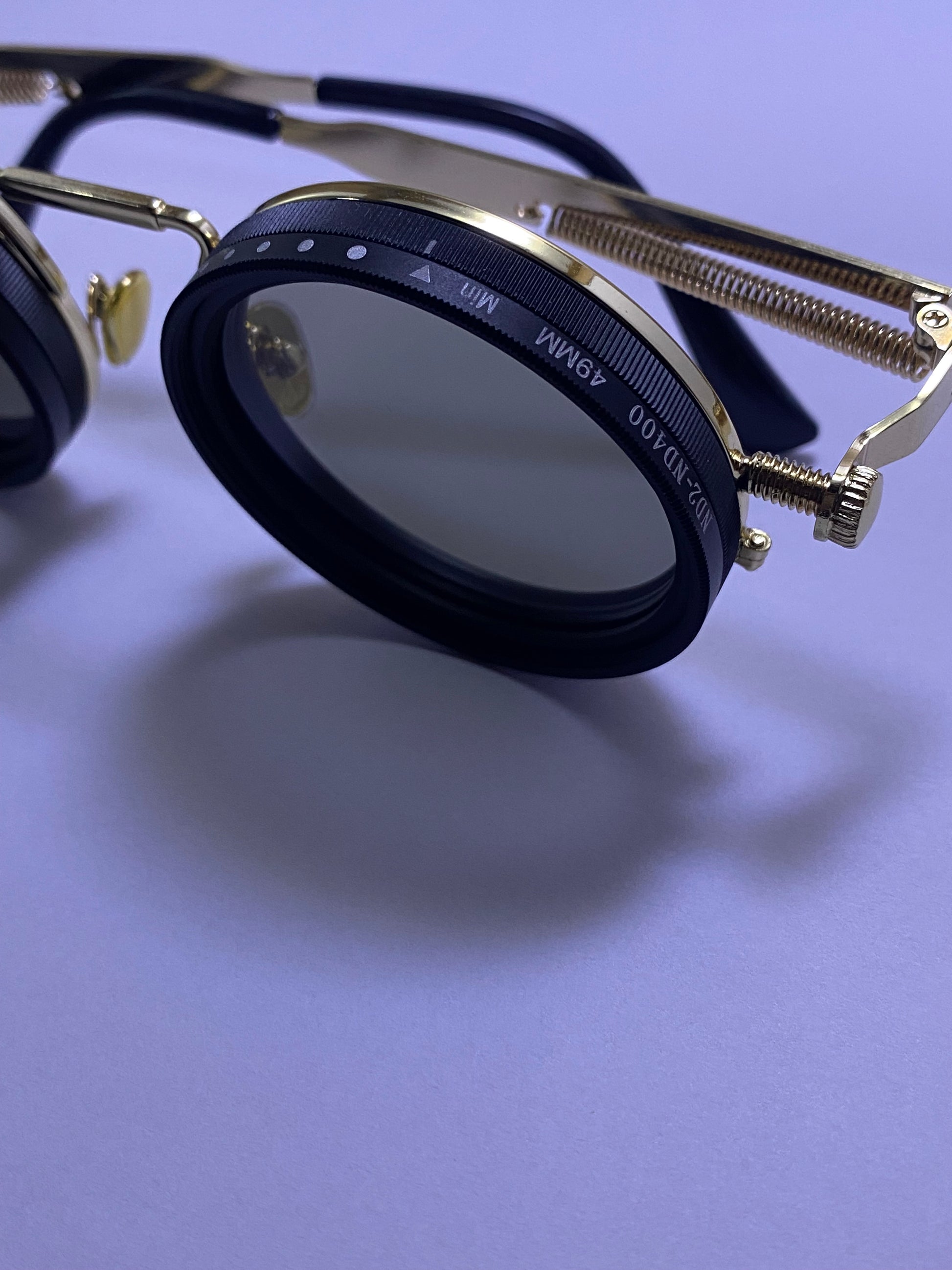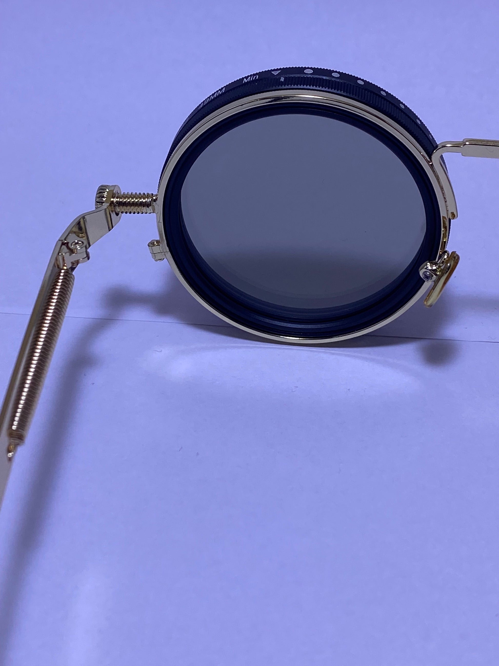 Die Scharniere sind robust und in passendem Goldton gehalten, was dem Gesamtbild eine luxuriöse Note verleiht. Mit einem Rahmenumfang von 49 mm passt die Brille sich angenehm an das Gesicht an. Ein besonderes Highlight: Die Tönungsstärke der Gläser lässt sich über den äußeren Rahmen flexibel von minimal bis maximal einstellen – ideal für wechselnde Lichtverhältnisse.